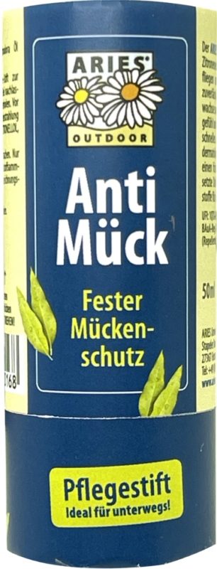 Der ARIES® Anti Mück Pflegestift hält Mücken, Stechfliegen und Zecken bis zu 6 Stunden zuverlässig fern. Hochwertige Pflanzenwachse sorgen für ein angenehmes Hautgefühl und die feste Textur ermöglicht ein schnelles und sauberes Auftragen. Die Rezeptur hat einen frischen Duft und für die ganze Familie geeignet.