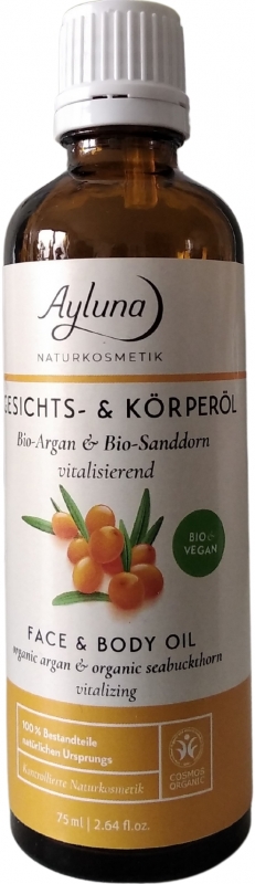 Das leichte und vitaminreiche Gesichts & Körperöl enthält wertvolle, natürliche Öle für eine strahlende Haut. Das Arganöl kann die Hautelastizität erhöhen und wirkt feuchtigkeitsspendend. Das Sanddornöl hinterlässt einen zarten Schimmer auf der Haut. Das Ayluna Körperöl eignet sich perfekt für trockene und reife Haut.