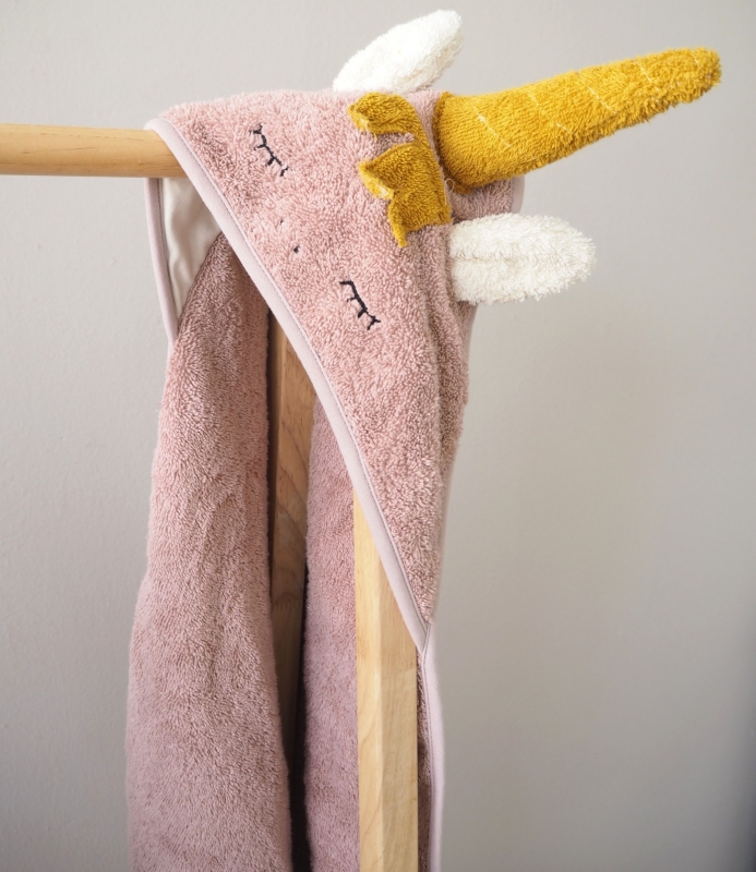 Mit der Kapuze über den Kopf gezogen ist das Kind vor Zugluft gut geschützt. Rundherum ist das Badetuch mit einem passenden Baumwollband eingefasst. Die niedlichen Schlenkerohren sowie das Einhorngesicht mit goldenem Horn sehen ganz allerliebst aus als ein fantastisches Wohlgefühl bleibt.