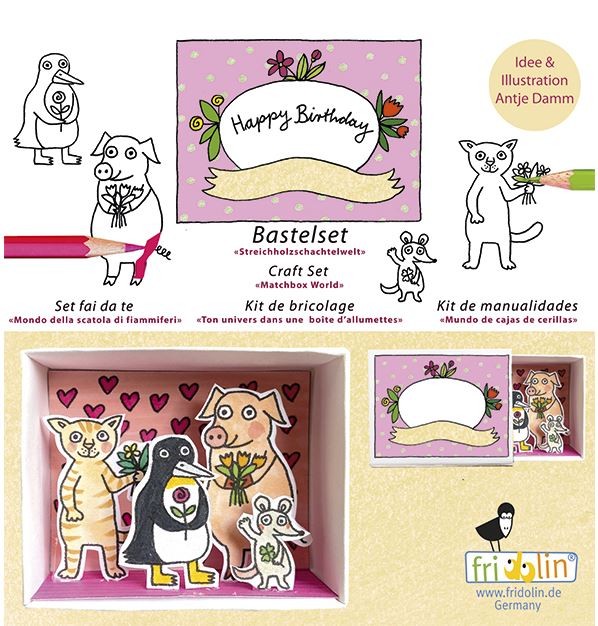 Basteln mit dem Fridolin Bastelset Glückwunsch bringt nicht nur Spaß, sondern kreiert bezaubernde kleine Kunstwerke. Durch Vorlage und vorgestanzten Figuren ist das Gestalten der Zündholzschachtel für Kinder ganz einfach.