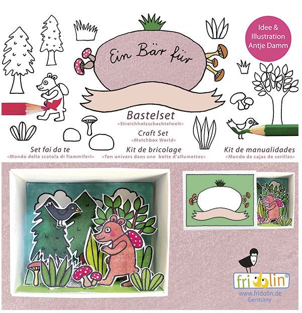 Basteln mit dem Fridolin Bastelset Wald, Bär und Pilze bringt nicht nur Spaß, sondern kreiert bezaubernde kleine Kunstwerke. Durch Vorlagen und vorgestanzten Figuren ist das Gestalten der Zündholzschachtel für Kinder ganz einfach.