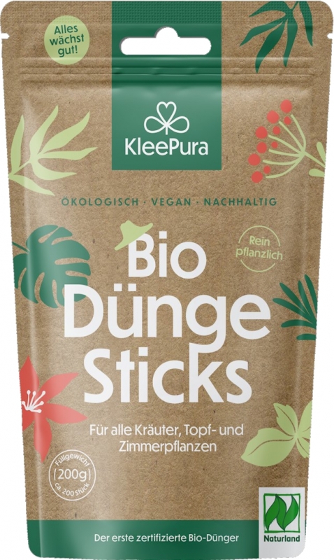 Die rein pflanzlichen KleePura Bio Düngesticks versorgen Kräuter, Blumen, Naschobst und Gemüse in Topf, Zimmer oder auf dem Balkon mit allem, was sie für vitales Wachstum brauchen - vollkommen unbedenklich für Familie, Tier und Umwelt. Mit natürlicher Sofort- und Langzeitwirkung.