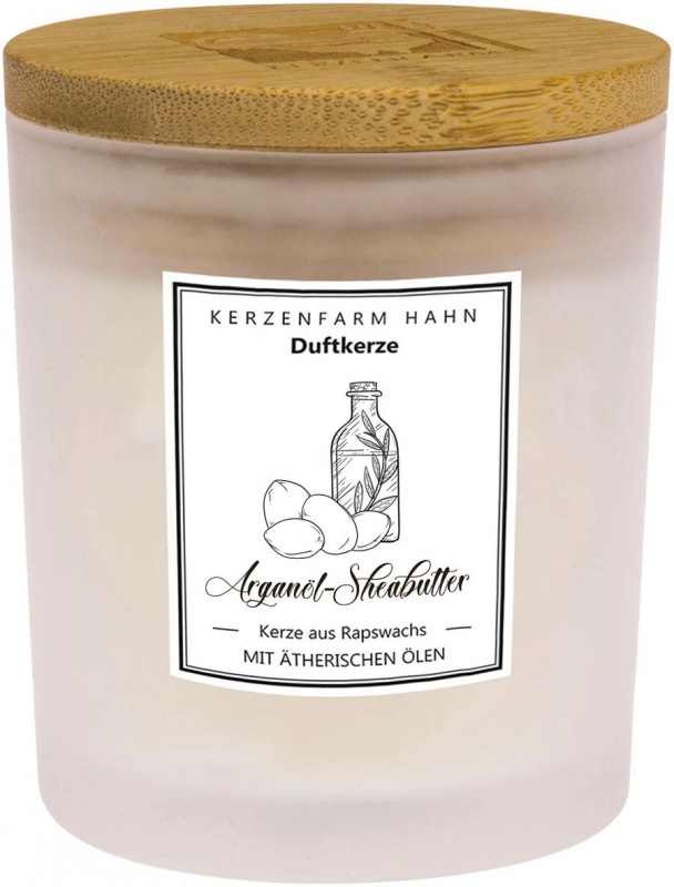 Duftkerze im weiß gefrosteten Glas, mit aromabewahrendem Holzdeckel, aus Rapswachs aus einem nachwachsenden Rohstoff mit ätherischen Ölen. Von Hand gegossen, ein reines Naturprodukt aus einem nachwachsenden Rohstoff mit Baumwolldocht. Ohne Zusatz von Farbstoffen.