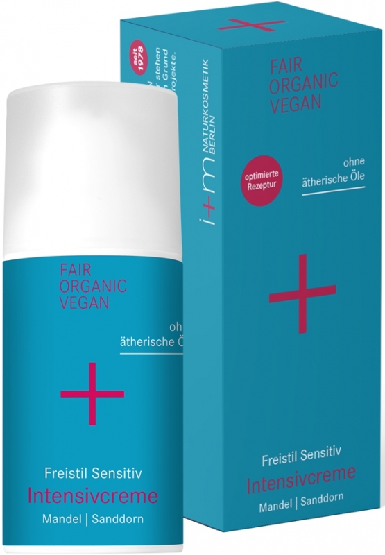 Die reichhaltige i+m Freistil Sensitiv Intensivcreme pflegt sensible, zu Allergien neigende Haut besonders intensiv und sanft zugleich. Trockene, gereizte Gesichtshaut versorgt sie mit lindernden Extrakten und nährenden Ölen. Dabei verzichtet die milde i+m Gesichtscreme auf ätherische Öle. Dank der Formulierung zieht die i+m Intensivcreme gut ein, ohne aufzuliegen. So hinterlässt sie einen spurlos entspannten Teint ohne Spannungsgefühle.