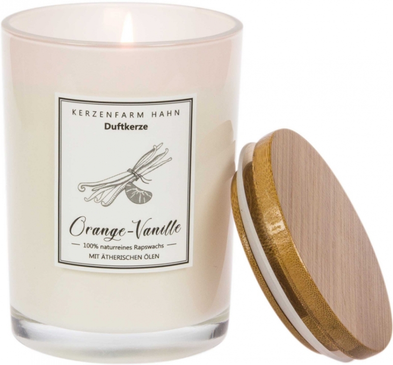 Große Duftkerze aus Rapswachs mit ätherischen Ölen, verschlossen mit einem aromadichtem Holzdeckel. Von Hand gegossen, ein reines Naturprodukt aus einem nachwachsenden heimischen Rohstoff mit Baumwolldocht. Ohne Zusatz von Farbstoffen.