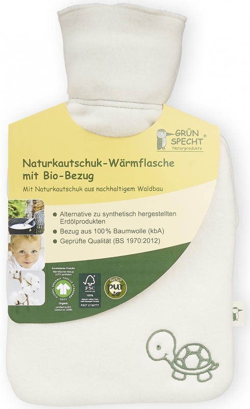 Im Gegensatz zu vielen herkömmlichen Wärmflaschen wird diese Grünspecht Wärmflasche aus Naturkautschuk gefertigt. Sie ist damit eine natürliche Alternative zu synthetisch hergestellten Erdölprodukten.