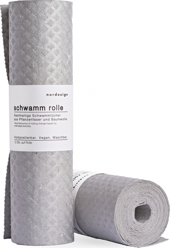 Die Haushaltsrolle in grau eignet sich hervorragend für den universellen Einsatz im Haushalt und zur sanften Reinigung verschiedenster Oberflächen. Jede Rolle enthält 12 Schwammtücher, die etwas dünner, aber großformatiger als herkömmliche Naturschwammtücher sind. Hergestellt und veredelt in Deutschland, sind die Schwammtücher liebevoll in einer Papierbanderole verpackt. Ein wesentlicher Vorteil gegenüber herkömmlichen Küchenrollen aus Papier ist die Wiederverwendbarkeit der Schwammtücher, die in Spül- und Waschmaschine gewaschen und dadurch länger genutzt werden können. Ein Haushalt mit vier Personen kann mit einer Rolle etwa drei Monate auskommen, danach können die Schwammtücher kompostiert werden.