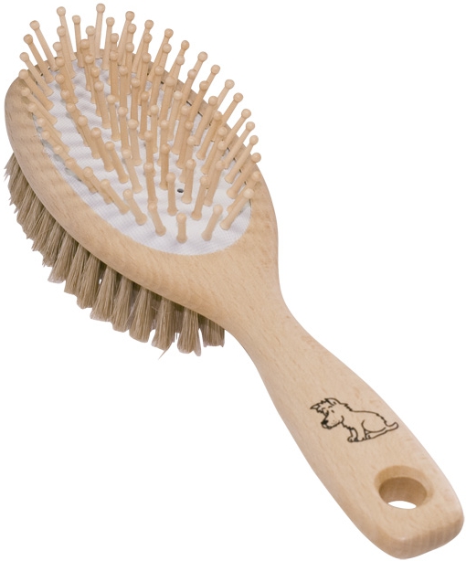 Doppelseitige Hundebürste ist geeignet zur Fellpflege bei Hunden mit unterschiedlichen Felllängen. Auf der einen Seite befinden sich Holznoppen, welche Schmutzpartikel und Staubpartikel entfernen können. Auf der anderen Seite sind Naturborsten mit denen das Fell glänzend gebürstet werden kann.