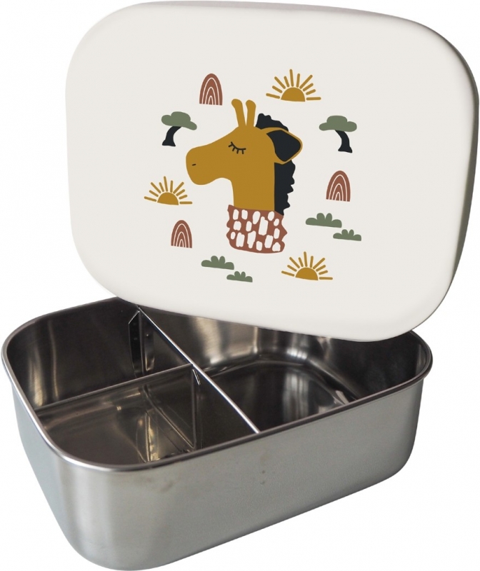 Die Kikadu Brotdose Giraffe bringt mit ihrem freundlichen Tiermotiv jeden Tag ein kleines Lächeln in die Frühstückspause. Kinder lieben die fröhliche Giraffe auf dem soften Silikondeckel, denn sie macht Lust auf Obststückchen, Gemüsestreifen und all die kleinen Lieblingssnacks, die einfach dazugehören. Die Dose besteht aus leichtem, stabilem Edelstahl und ist damit ideal für Kindergarten, Schule oder den nächsten Ausflug. Innen wartet eine praktische Unterteilung in drei Fächer, sodass alles seinen Platz behält – ganz ohne Durcheinander. Ob süß, herzhaft oder beides gemischt: Die Kikadu Brotdose hält alles sicher voneinander getrennt, ohne dabei Gerüche oder Farben aufzunehmen. Durch ihre Form passt sie bequem in Kinderhände und Rucksäcke und begleitet kleine Naschkatzen jeden Tag aufs Neue.