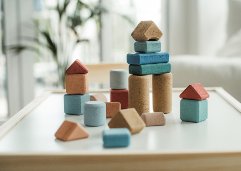 Kork ist einer der natürlichsten CO2 Speicher der Erde. Für Korko muss kein Baum gefällt werden, da nur die Rinde der Korkeiche geschält wird. Kork ist im Vergleich zu herkömmlichen Baustein-Materialien besonders dämpfend und selbst der höchste Turm fällt superweich und leise. Die einzigartige Beschaffenheit des Materials macht es rutschfester und bietet daher unendlich viele Spielmöglichkeiten.