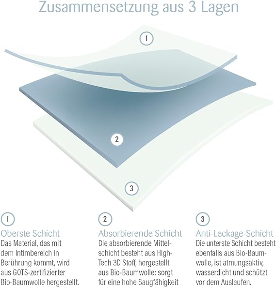 Die unterste Schicht besteht ebenfalls aus Bio Baumwolle, ist atmungsaktiv, wasserdicht und schützt vor dem Auslaufen.
