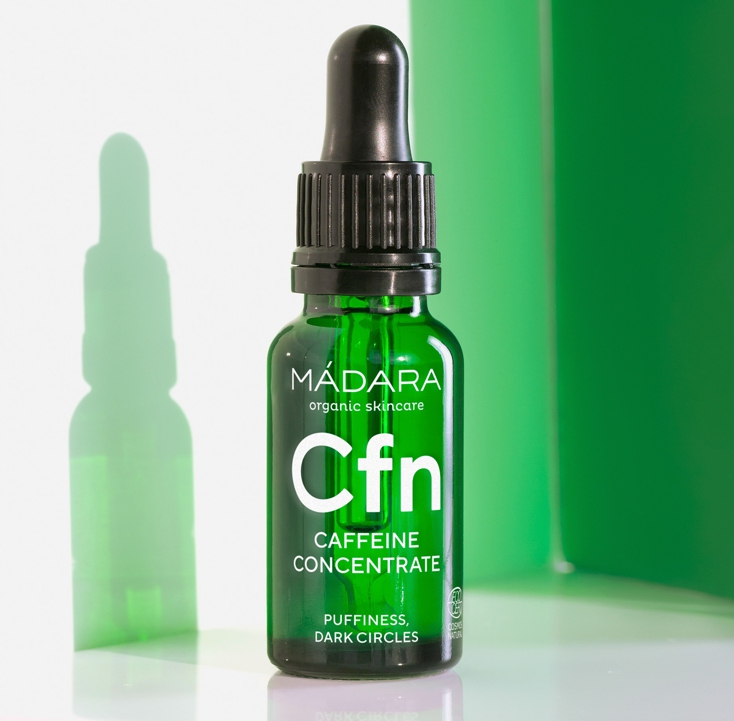 Madara Cfn Koffein Konzentrat erfrischt und erhellt die Haut, und kann bei Augenringen und Rötungen verwendet werden. Koffein kann das Erscheinungsbild der müden Haut verbessern und ist gleichzeitig ein wertvoller Cellulite-Inhaltsstoff, der sich positiv auf das Hautbild auswirken kann.