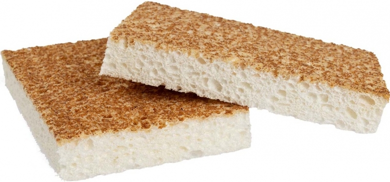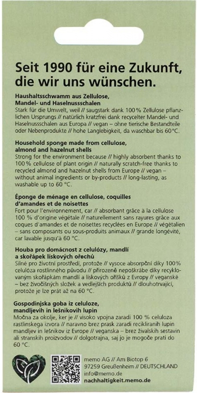 memo Haushaltsschwamm aus Zellulose sowie Mandel und Haselnussschalen. Mit einer sehr saugfähige Schwammseite, die zu 100% aus pflanzlichen Zellulosefasern besteht.