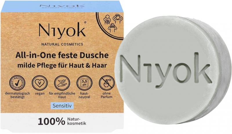 Niyok All-in-One feste Dusche für Haut, Haare und Gesicht ganz ohne Duftstoffe. Dieses eine Stück vereint gleich drei Produkte und bleibt dabei trotzdem sanft zur Haut. Mit einem hautneutralen pH-Wert von 5,5 spendet es der Haut durch den Einsatz von Sheabutter zusätzlich Feuchtigkeit. Teile der Guarpflanze dienen als Conditioner und pflegen das Haar bis in die Spitzen.