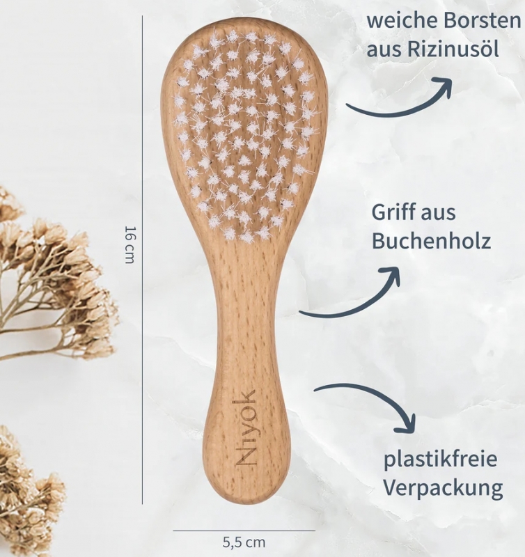 Diese kleine Babybürste mit weichen Borsten wurde speziell für die empfindliche Kopfhaut von Babys und Kleinkindern entwickelt. Das Buchenholz sorgt für eine stabile und langlebige Verarbeitung, während die Borsten aus einer flauschig-weichen Rizinusöl-Nylon-Mischung bestehen. Die feinen Borsten gleiten sanft durch das Haar, ohne unangenehmes Ziehen zu verursachen. Sie sind weich genug, um die Kopfhaut behutsam zu massieren.
