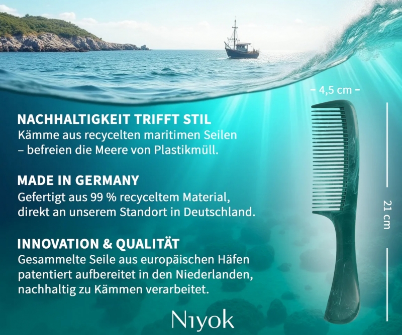 Was früher als Schiffstau auf den Weltmeeren unterwegs war, wird heute zu langlebigen Kämmen verarbeitet. Die ausgedienten Seile stammen aus europäischen Häfen, werden in den Niederlanden zu Recyclingmaterial verarbeitet und anschließend in Deutschland zu stabilen Kämmen geformt. Statt als Plastikmüll im Wasser zu landen, erhalten sie bei Niyok ein neues Leben – und sind nun über unseren Shop bio-naturwelt.de erhältlich. Jeder Kamm bringt Herkunft mit, Funktion und eine klare Haltung: sinnvoll nutzen, statt achtlos entsorgen.