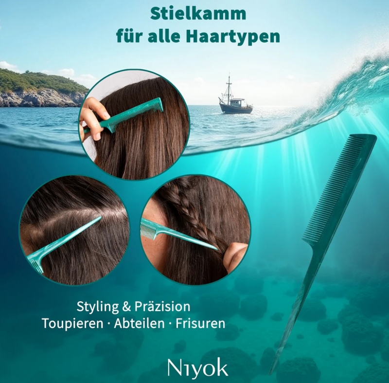 Wenn Präzision gefragt ist, greift man zum Niyok Stielkamm. Der schmale, spitz zulaufende Griff trennt Haarpartien sauber und ermöglicht kontrolliertes Arbeiten – ob beim Föhnen, Glätten, Flechten oder beim Auftragen von Farbe. Die eng gesetzten Zinken gleiten gleichmäßig durch das Haar und sorgen für ein glattes Ergebnis ohne Ziepen. Für alle, die Wert auf definierte Linien und klare Strukturen legen, ist dieser Kamm unverzichtbar.