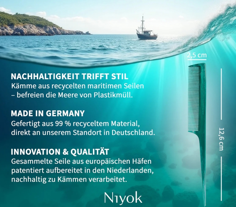 Alte maritime Seile landen oft als Abfall in den Weltmeeren und belasten dort dauerhaft die Umwelt. Niyok verarbeitet dieses Material zu widerstandsfähigen Kämmen und verbindet so hochwertige Arbeit mit einer sinnvollen Wiederverwertung. Gefertigt aus 99 % recycelten Schiffstauen überzeugen die Kämme nicht nur durch seine Funktionalität, sondern auch durch diese besondere Herkunft. Jede Oberfläche zeigt individuelle Maserungen, wodurch jedes Stück ein Unikat ist. Die abgerundeten Zinken sind sanft zur Kopfhaut, schonen die Haarstruktur und machen den Kamm robust für den täglichen Gebrauch.