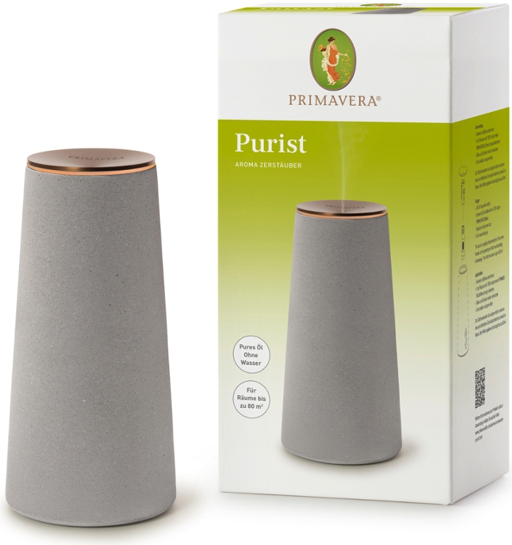 Mit klarer Form und natürlichem Design bietet der Primavera Aroma Zerstäuber Purist einen stilvollen Blickfang und fügt sich elegant in jede Inneneinrichtung ein. Sein schlichtes Gehäuse besteht aus hochwertigem Beton und Metall. In Kombination mit einer auswechselbaren Düse und reduzierten Innenbauteilen aus BPA-freiem Kunststoff wird der dekorative Zerstäuber zu einem nachhaltigen und langlebigen Duftbegleiter.