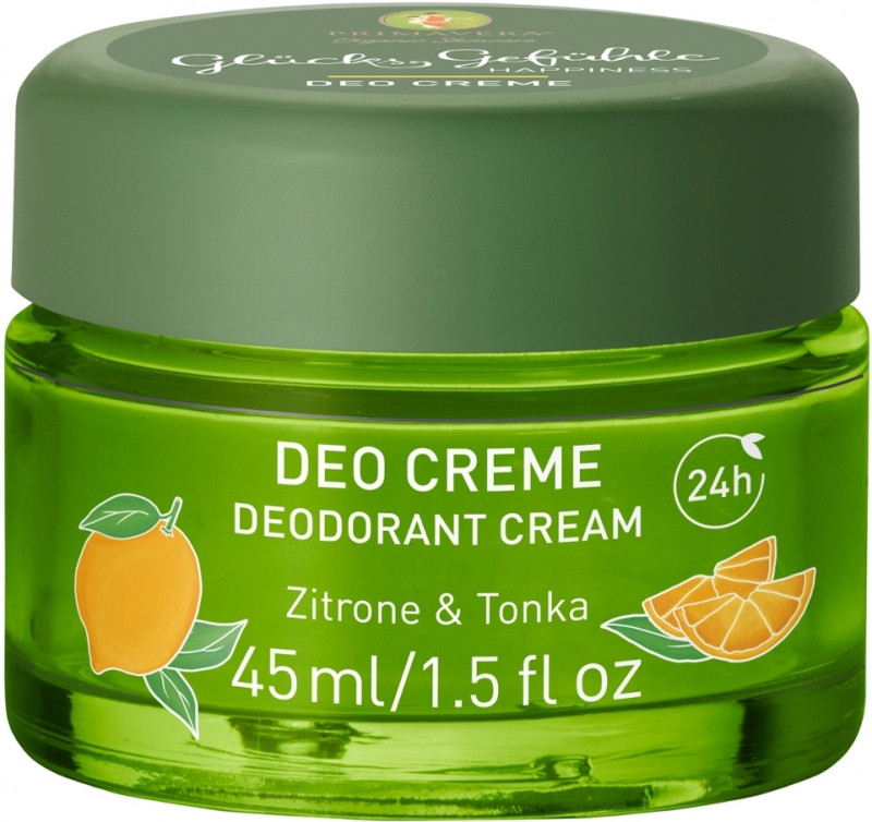 Die Primavera Deo Creme Glücksgefühle mit ihrem sonnig-leichten Duft aus Bio Zitrone und Bio Tonka schenkt Momente des Glücklichseins. Bietet 24-Stunden-Schutz ohne Aluminiumsalze.