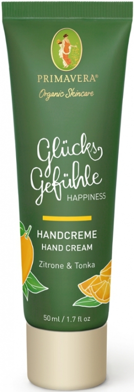 Die spritzig-leichte Rezeptur der Primavera Handcreme Glücksgefühle pflegt die Haut, spendet intensive Feuchtigkeit und gilt mit seinem erheiternden Duft aus Bio Zitrone und Bio Tonka für einen erfrischenden Gücklichmacher.