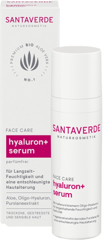 Das regenerationsfördernde Hyaluron Serum von SantaVerde sorgt für Langzeit-Feuchtigkeit bis in die tieferen Hautschichten und kann die Elastizität verbessern.