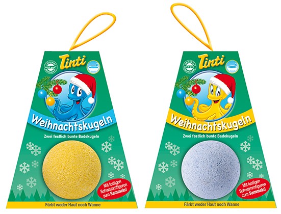 Die Tinti Weihnachtskugeln in den Farben blau, rot und gelb lösen sich in der Badewanne sprudelnd auf und zaubert neben einem bunten Farbspiel auch noch eine Überraschung ins Badewasser. Mit Natur- und Lebensmittelfarben.