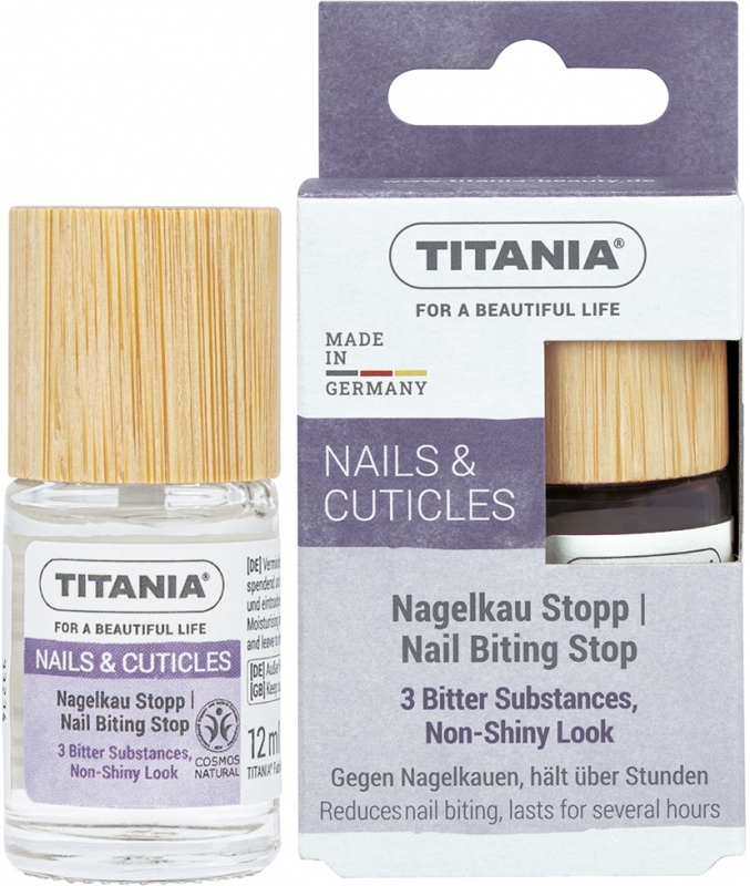 Titania Nagelkau Stopp mit Denatonium Benzoate, Eukalyptusöl und Blutorangenöl vermindert den Drang zum Nägel kauen und hält über mehrere Stunden, selbst nach dem Händewaschen. Feuchtigkeitsspendende Inhaltsstoffe unterstützen das Nachwachsen der Nägel.