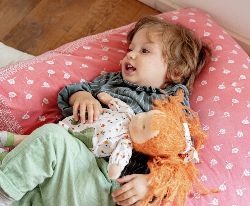 Diese Materialwahl bietet dem Kind ein besonderes haptisches Erlebnis. Die Schafschurwolle im Inneren speichert Wärme und fühlt sich dadurch für das Kind immer angenehm warm und vertraut an. Dies schafft schnell eine tiefe Bindung zur Waldorfpuppe Elsa.