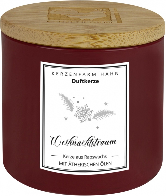 Weihnachtskerze aus Rapswachs mit ätherischen Ölen, verschlossen mit einem aromadichtem Holzdeckel. Von Hand gegossen, ein reines Naturprodukt aus einem nachwachsenden heimischen Rohstoff mit Baumwolldocht. Ohne Zusatz von Farbstoffen.
