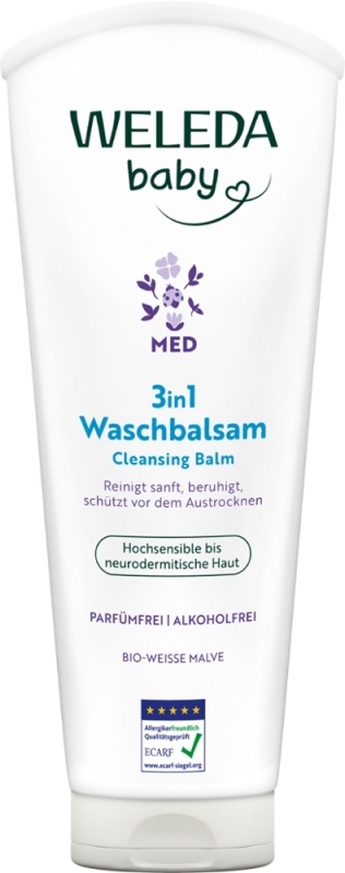 Die seifenfreie Rezeptur des Weleda Med Baby Waschbalsams mit Weißer Bio Malve, Bio Nachtkerzenöl und Mondo-Graswurzelextrakt reinigt die empfindliche Haut besonders schonend. Gleichzeitig versorgt der Waschbalsam die Haut mit wertvollen Lipiden, wirkt rückfettend und hinterlässt eine geschmeidige Babyhaut.