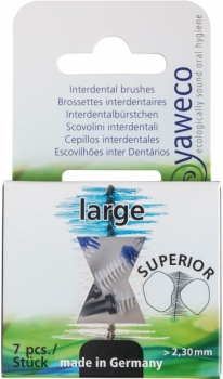 Yaweco Interdentalbürstchen ist tailliert. Die äußeren, längeren, blauen Borsten klappen nach Einführen in den Interdentalraum auf und reinigen auch die Hinterseite des Zahnes umfassend. Die Bürsten sind wechselbar, nur das wirklich verbrauchte Teil wird entsorgt. Die Bürstenträger sind kleinstmöglich konzipiert.