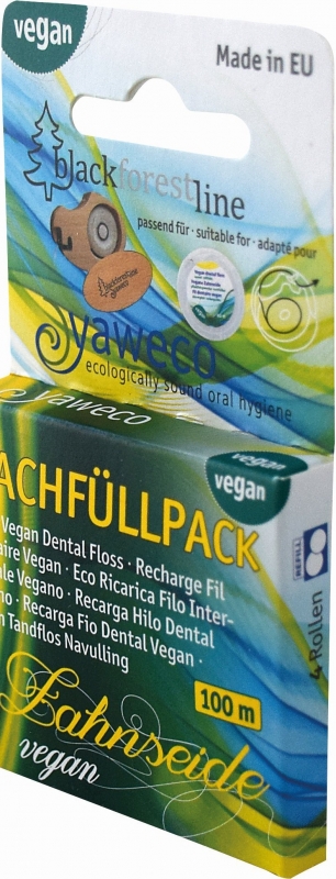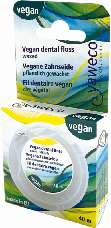 Vegane Yaweco Zahnseide aus PLA, pflanzlich gewachst. Sanft zum Zahnfleisch, reinigt die Zahnseide gründlich die Zahnzwischenräume. Die Spenderdose ist nachfüllbar - schont die Umwelt und spart Ressourcen.